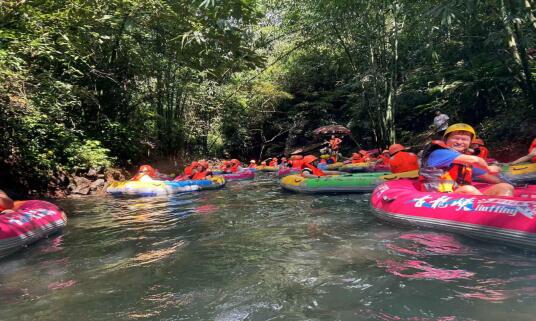 小伙伴們乘著皮艇順流而下,穿梭在蜿蜒流動(dòng)的河溪中,四面青山環(huán)繞,漂流其間,迎面而來的涼風(fēng)和水珠沖刷掉了夏日的酷熱。