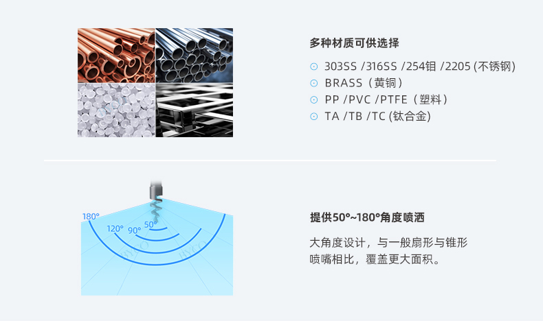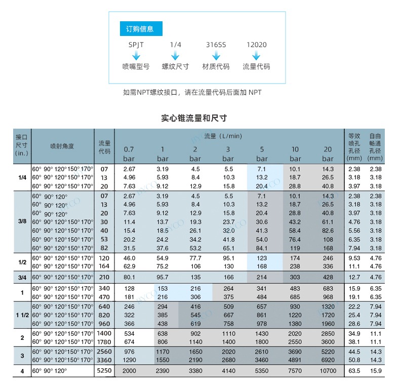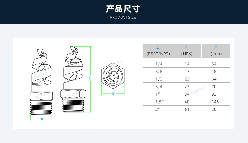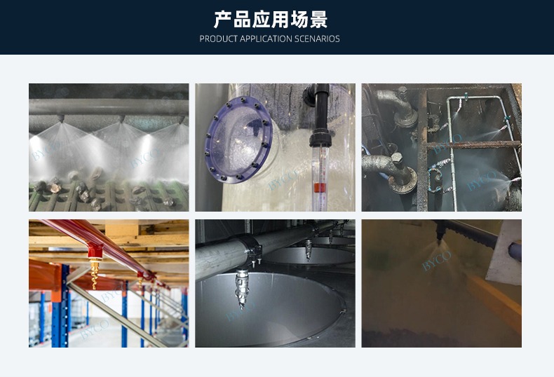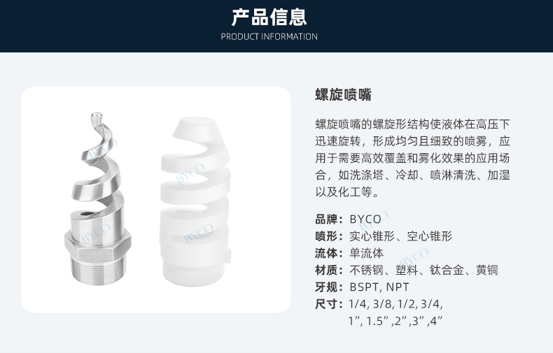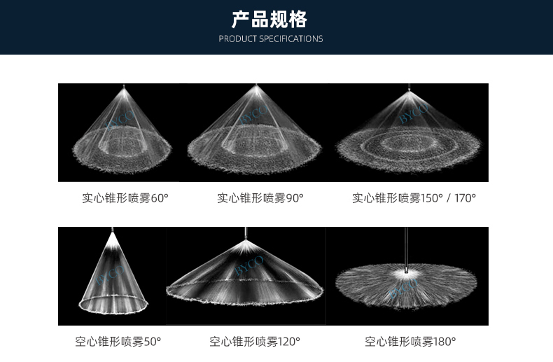 內部為大流量通道設計,最大程度地減少液體阻塞。螺旋噴嘴產生實心(空心)錐形噴霧,液滴相對較為粗糙。