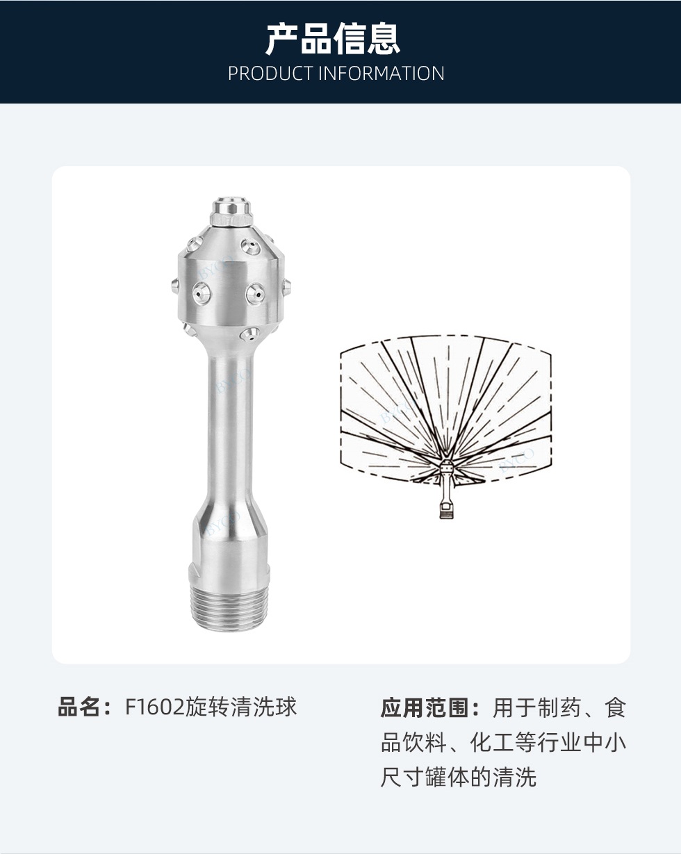 特點:固定式,用戶直徑達1.6米的槽罐,噴嘴固定,清洗或漂洗小容器的效果理想,多孔噴射,噴射的覆蓋面和形狀有多種選擇。耐用、抗腐蝕設計。